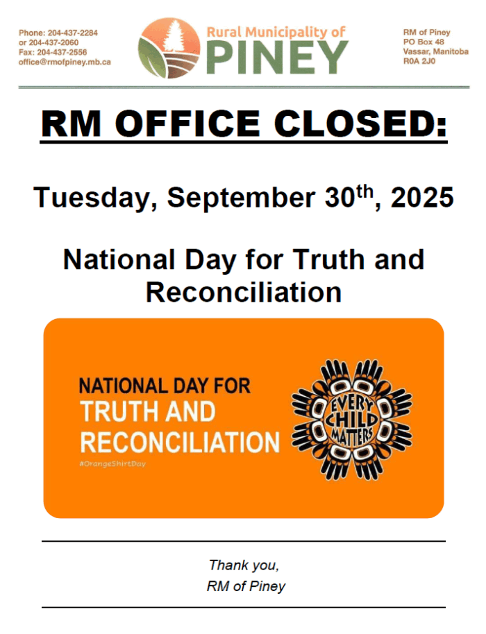 Office Closure Notice News & Notices, Office AdminBy adminAugust 19, 2025The RM office is closed Tuesday, September 30, 2025 for Truth and Reconciliation Day!